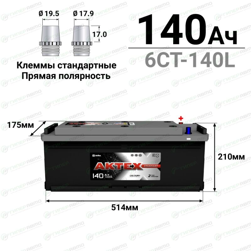 Вы можете купить аккумулятор актех standart тт l7r (6ст-140l / 140-3-l-k), 140ач, сса 1000а, обслуживаемый в интернет-магазине автомобильных аккумуляторов Гиперавто. Цена на АКТЕХ 6СТ-140L, описание, характеристики и фотографии.