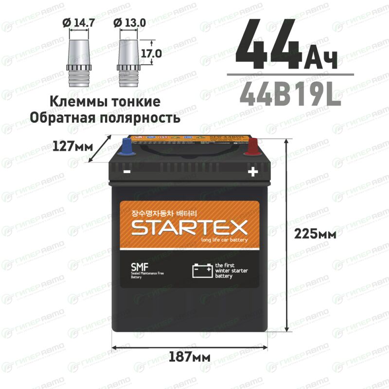 Вы можете купить аккумулятор startex 44b19l, 44ач, cca 350а, необслуживаемый в интернет-магазине автомобильных аккумуляторов Гиперавто. Цена на Startex SMF44B20/19L.STX Китай, описание, характеристики и фотографии.