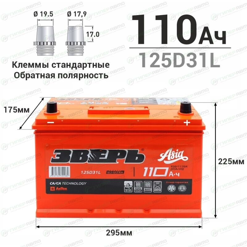 Вы можете купить аккумулятор зверь asia 125d31l (6ст-110vl / 110-3-r), 110ач, сса 930а, необслуживаемый в интернет-магазине автомобильных аккумуляторов Гиперавто. Цена на ЗВЕРЬ (АКБ) CMF125D31L.ZVA, описание, характеристики и фотографии.