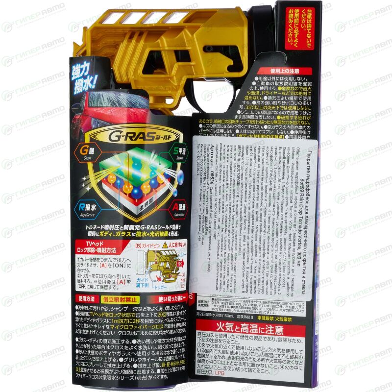 Это эволюция средства Rain Drop Bazooka — одновременное покрытие кузова и стекла. Новая насадка Tornado Vortex Head (TV Head) повышает скорость и упрощает нанесение. Просто распылите и протрите, чтобы активировать защитный эффект G-RAS, значительно превосходящий существующие технологии: 5 месяцев глубокого блеска и гидрофобной защиты кузова, а также 3 месяца водооталкивающего эффекта для стекол.