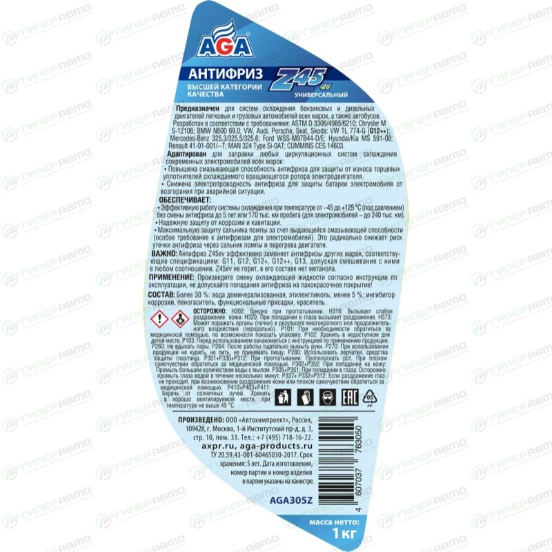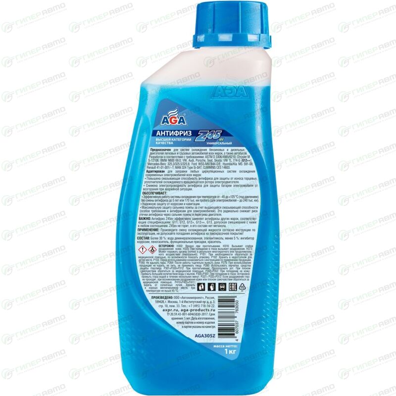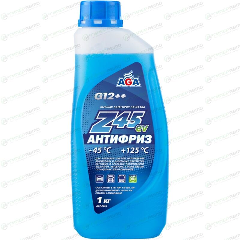 Антифриз AGA-Z45EV — это универсальная охлаждающая жидкость высшей категории качества. Предназначен для систем охлаждения бензиновых и дизельных двигателей легковых и грузовых автомобилей всех марок, а также автобусов. Антифриз Z45ev эффективно заменяет антифризы других марок, соответствующие спецификациям: G11, G12, G12+, G12++, G13, допуская смешивание с ними в любом соотношении. Z45ev не горит, в его составе нет метанола.