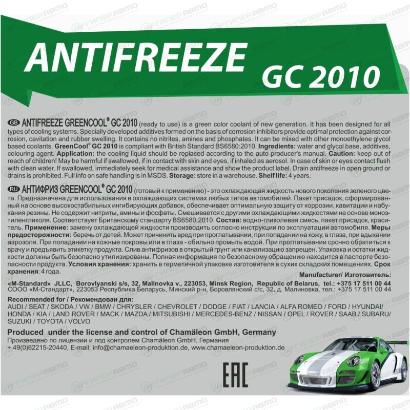 Антифриз GreenCool GC 2000/GC 2010 — это готовая к применению охлаждающая жидкость зеленого цвета. Соответствует Британскому стандарту BS6580:2010. Производится по лицензии и под контролем Chamäleon GmbH (Германия). Для использования в системах охлаждения легковых автомобилей, а так же в качестве теплоносителя в теплообменных агрегатах в диапазоне температур от -40 до +110 °С.