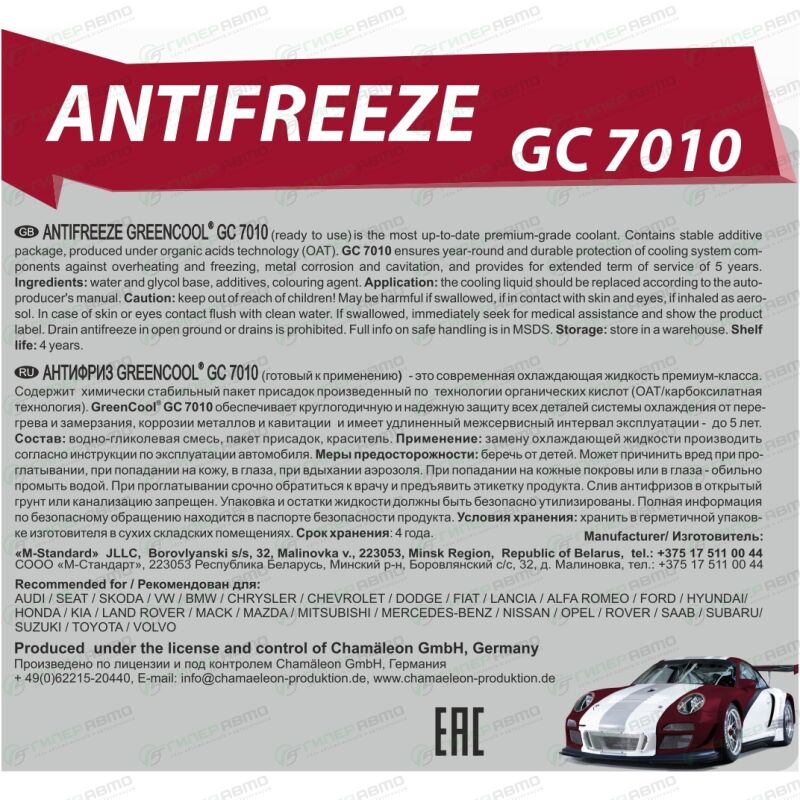 Антифриз GreenCool GC 7010 — это готовая к применению охлаждающая жидкость премиум класса LLC (Long Life Coolant)/ SNF (Silicate Nitrite Free). Соответствует Британскому стандарту BS6580:2010. Производится по лицензии и под контролем Chamäleon GmbH (Германия). Для использования в системах охлаждения любых типов автомобилей, а также в качестве теплоносителя в теплообменных агрегатах в диапазоне температур от -40 до +110 °С.