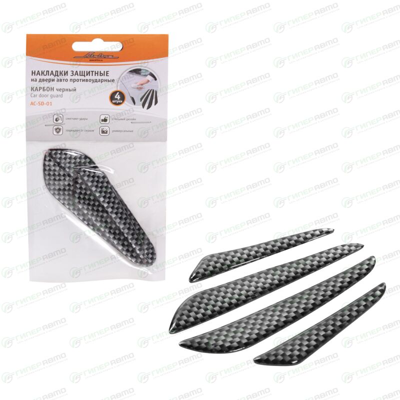 Предназначены для защиты двери от удара при открывании. Наклеиваются на кромку двери автомобиля за счет двустороннего скотча с оборотной стороны. Накладки сделаны из пвх и имеют выпуклую 3D форму. На лицевой стороне расположен рисунок имитирующий карбон.