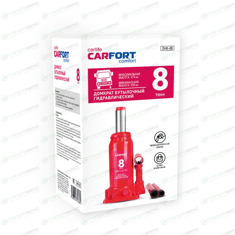 Благодаря жесткой конструкции и гидравлическому механизму, бутылочный домкрат очень устойчив. Складная ручка присоединяется к домкрату и позволяет поднять автомобиль на нужную высоту без лишних усилий