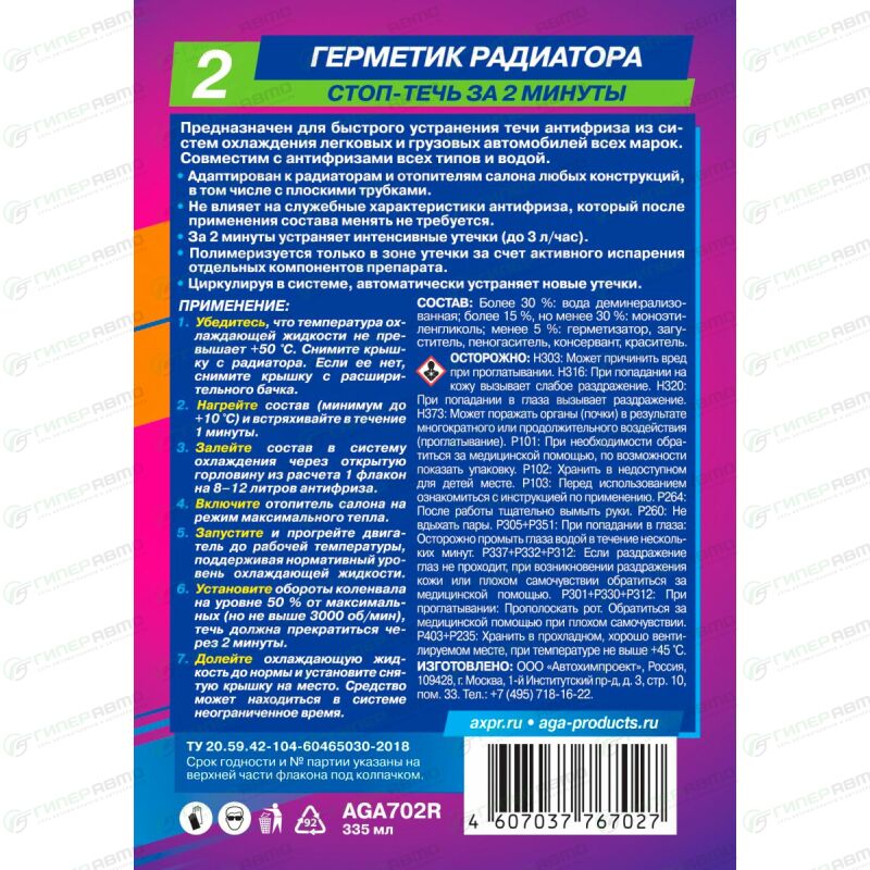 - Циркулируя в системе охлаждения, автоматически устраняет новые утечки.