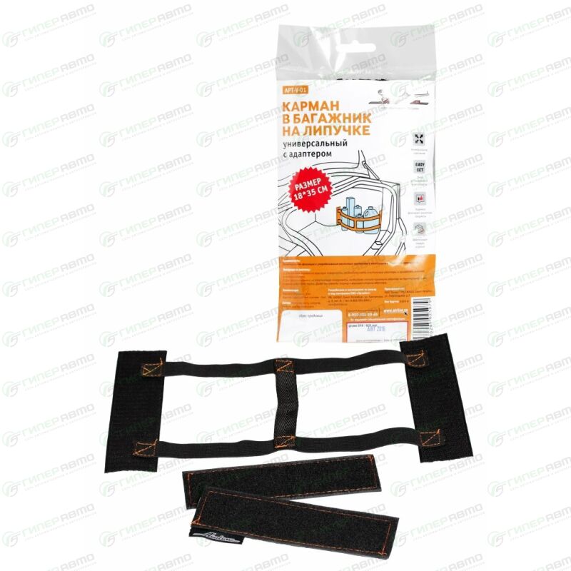 Кармашек надежно прикрепляется к ворсовому покрытию багажника при помощи липучки и предназначен для фиксации различного рода предметов, таких как огнетушители малых объемов, баллончики автохимии, перчатки, салфетки и т.п. В комплекте прилагается два адаптера с двойным скотчем для автомобилей, не имеющих ворсового покрытия в багажнике.