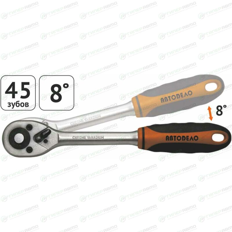 Корпус трещотки АВТОДЕЛО изготовлен из хром-ванадиевой инструментальной стали методом горячей штамповки с последующей закалкой и защищён от коррозии хромовым покрытием.