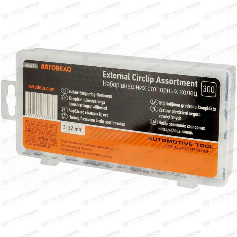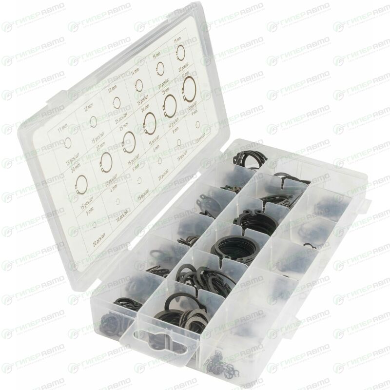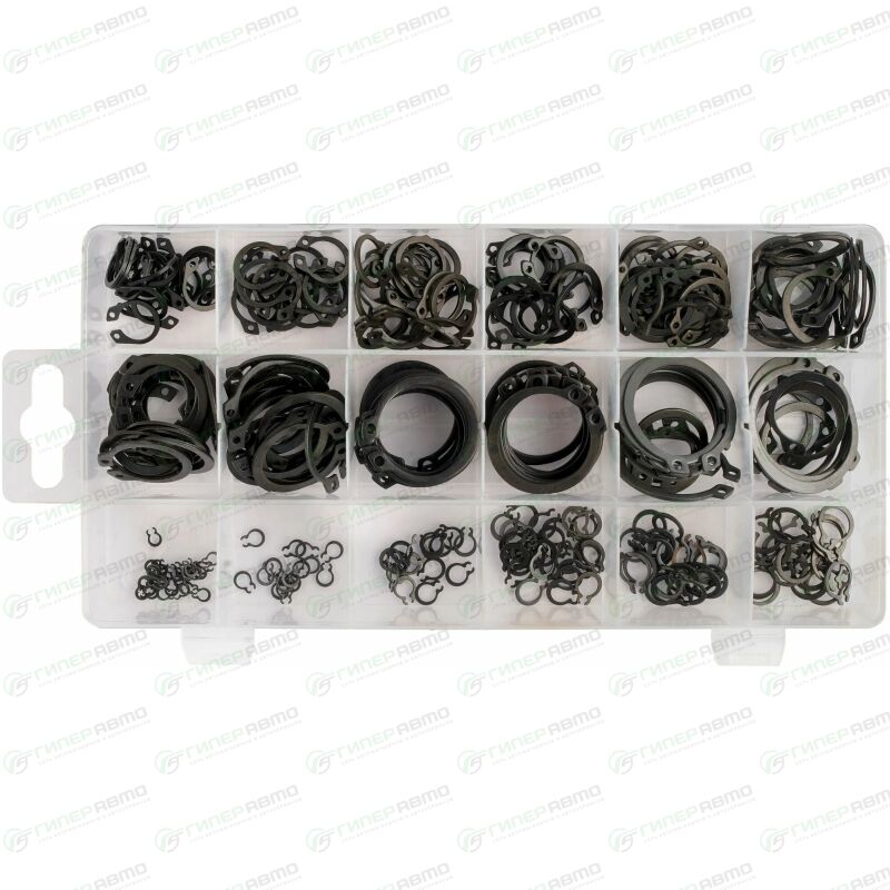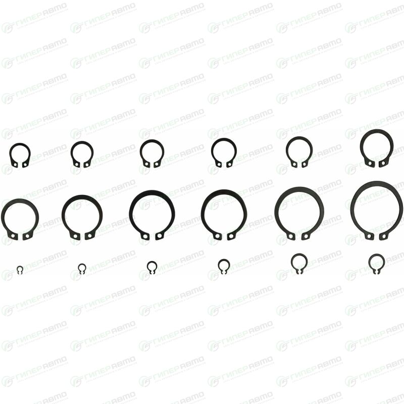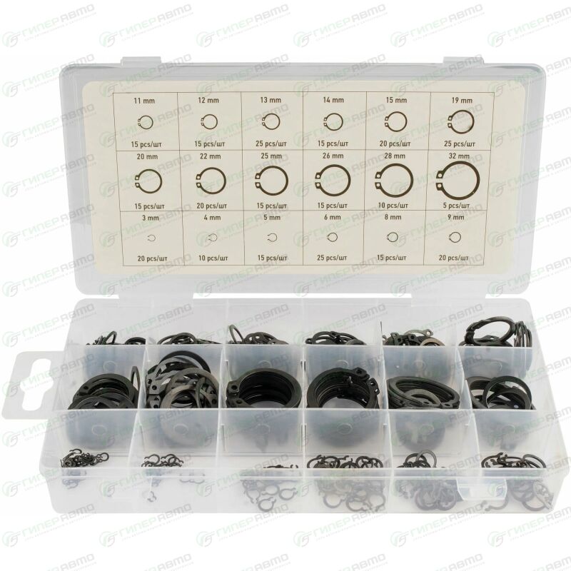 Набор внешних стопорных колец применяется для фиксации деталей узлов и агрегатов автомобиля. Кольца изготовлены из стали и имеют отверстия для съёмника. Размеры колец от 3 до 32 мм. Набор поставляется в удобном пластиковом кейсе.