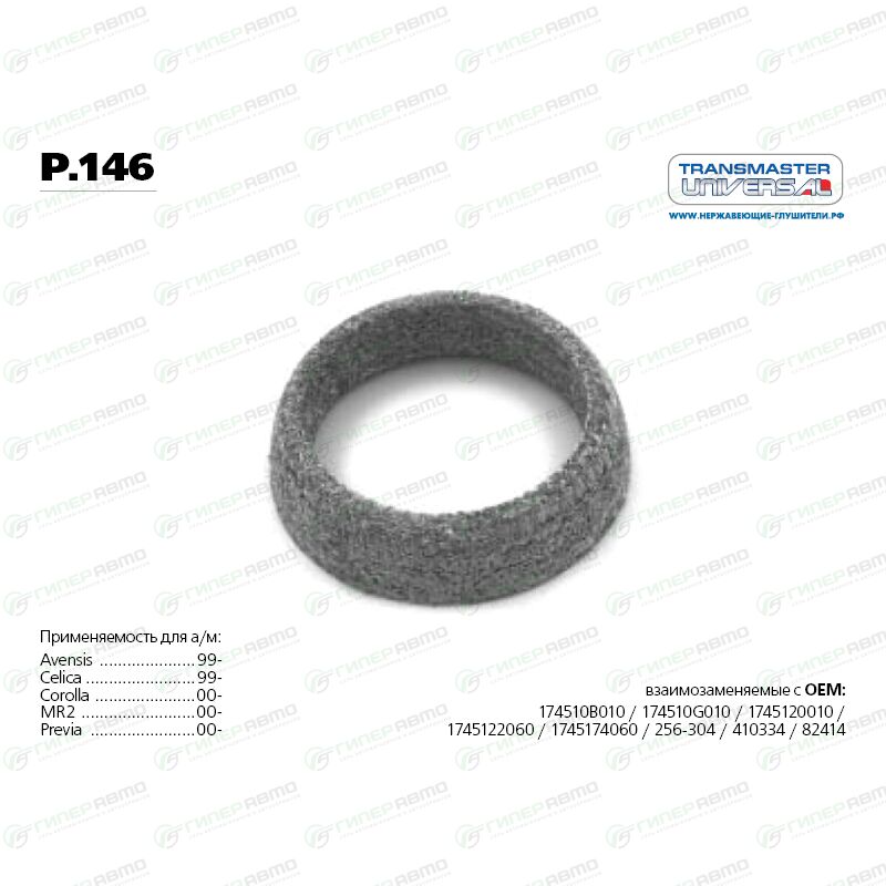 Вы можете купить кольцо уплотнительное выхлопной трубы transmaster universal, арт. p.146 в интернет-магазине прокладок и уплотнительных колец выхлопной системы Гиперавто. Цена на TRANSMASTER p.146, описание, характеристики и фотографии.