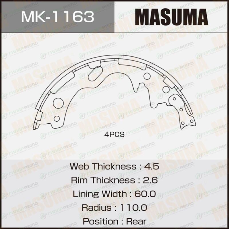 MASUMA MK-1163. Купить колодки тормозные барабанные masuma, комплект на ось (4 шт), арт. mk-1163 по выгодной цене в интернет-магазине запчастей Гиперавто. (11411)