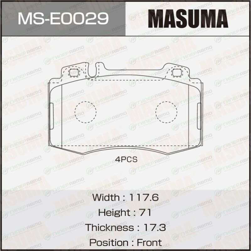 MASUMA MS-E0029. Купить колодки тормозные дисковые masuma, передние, комплект на ось (4 шт), арт. ms-e0029 по выгодной цене в интернет-магазине запчастей Гиперавто. (76919)