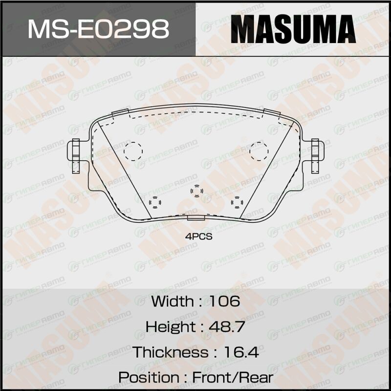 MASUMA MS-E0298. Купить колодки тормозные дисковые masuma, передние, комплект на ось (4 шт), арт. ms-e0298 по выгодной цене в интернет-магазине запчастей Гиперавто. (70330)