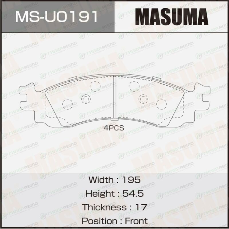 Вы можете купить колодки тормозные дисковые masuma, передние, комплект на ось (4 шт), арт. ms-u0191 в интернет-магазине колодок Гиперавто. Цена на MASUMA MS-U0191, описание, характеристики и фотографии.