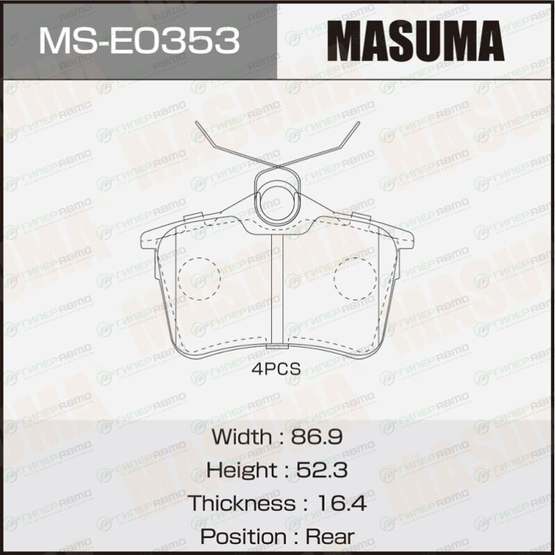 Вы можете купить колодки тормозные дисковые masuma, задние, комплект на ось (4 шт), арт. ms-e0353 в интернет-магазине колодок Гиперавто. Цена на MASUMA MS-E0353, описание, характеристики и фотографии.