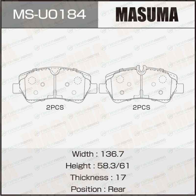 Вы можете купить колодки тормозные дисковые masuma, задние, комплект на ось (4 шт), арт. ms-u0184 в интернет-магазине колодок Гиперавто. Цена на MASUMA MS-U0184, описание, характеристики и фотографии.