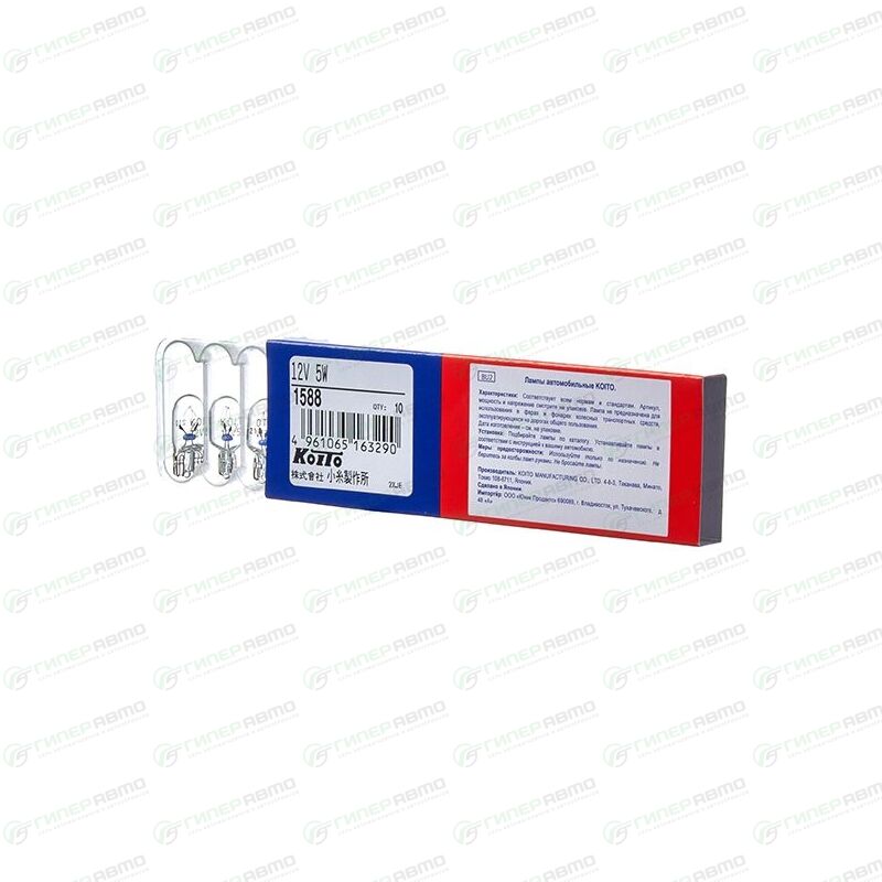 Вы можете купить лампа koito w5w (w2.1x9.5d, t10), 12в, 5вт, арт. 1588 в интернет-магазине автомобильных ламп Гиперавто. Цена на KOITO 1588, описание, характеристики и фотографии.