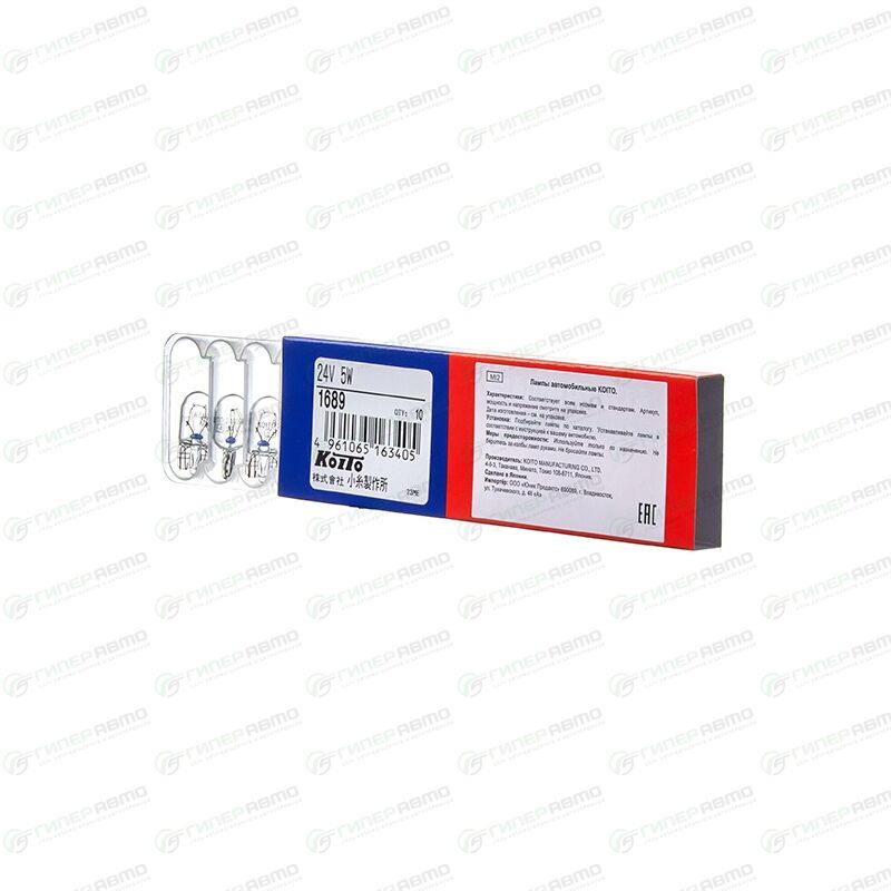 Вы можете купить лампа koito w5w (w2.1x9.5d, t10), 24в, 5вт, арт. 1689 в интернет-магазине автомобильных ламп Гиперавто. Цена на KOITO 1689, описание, характеристики и фотографии.