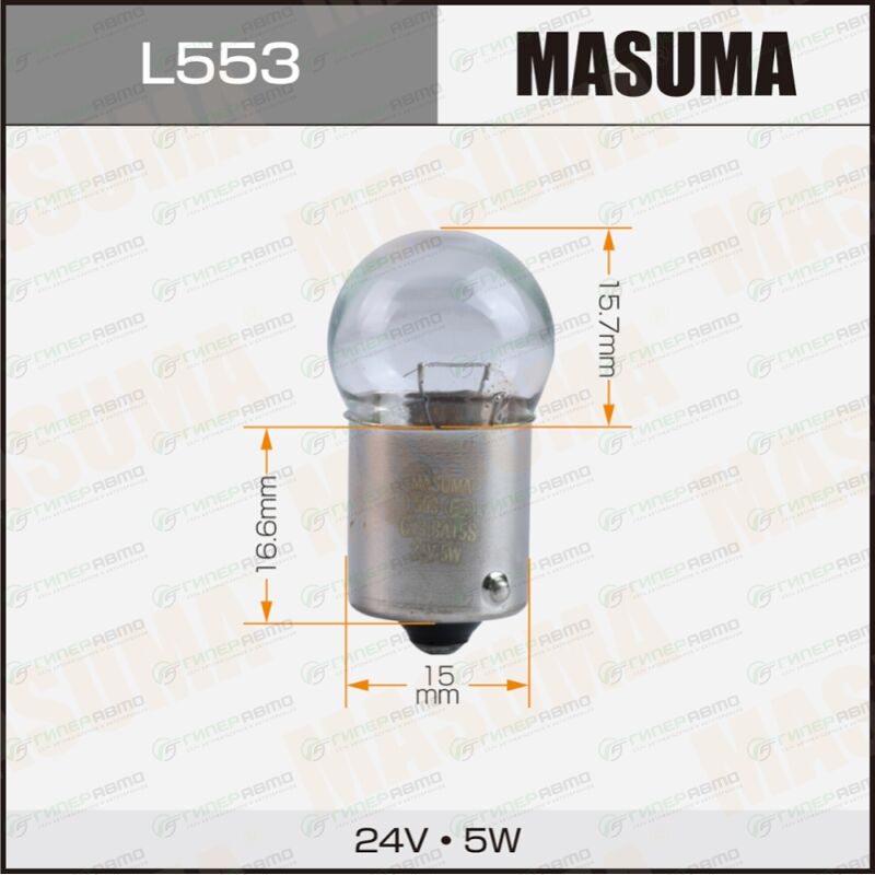 Вы можете купить лампа masuma r5w (ba15s, g18), 24в, 5вт, комплект 10 шт в интернет-магазине автомобильных ламп Гиперавто. Цена на MASUMA L553, описание, характеристики и фотографии.