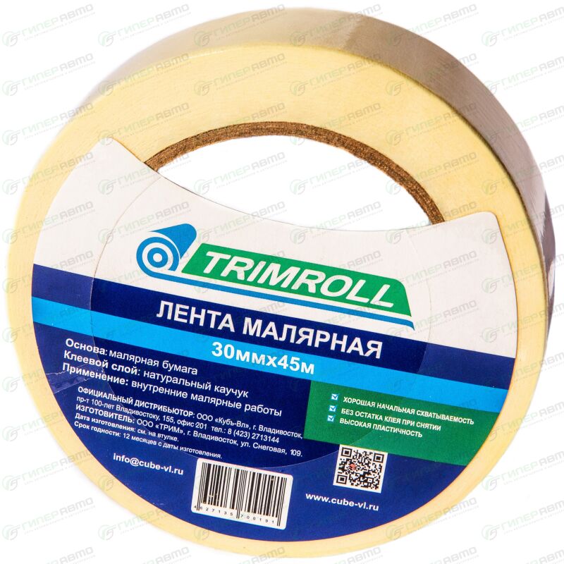 Вы можете купить лента клейкая малярная (крепп) trimroll, 30мм x 45м, арт. 30-45 в интернет-магазине лент клейких и изолент Гиперавто. Цена на Trimroll 30-45, описание, характеристики и фотографии.