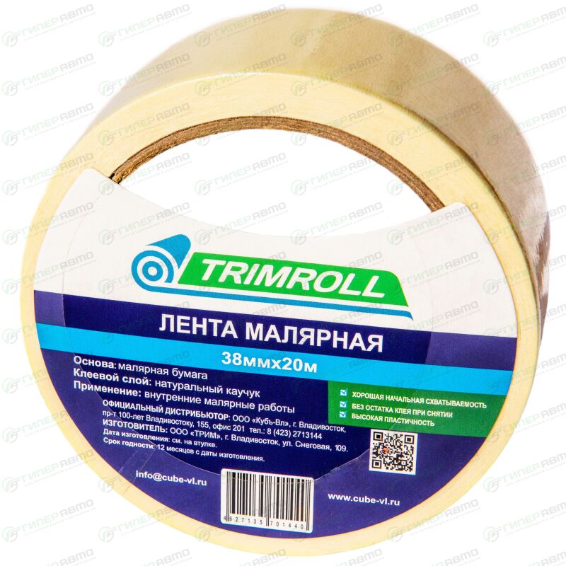 Вы можете купить лента клейкая малярная (крепп) trimroll, бумажная, 38мм x 20м, арт. 38-20 в интернет-магазине лент клейких и изолент Гиперавто. Цена на Trimroll 38-20, описание, характеристики и фотографии.