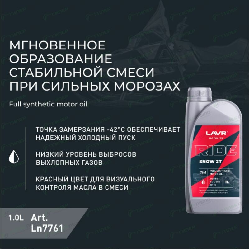 Полностью синтетическое моторное масло для двухтактных двигателей снегоходов с воздушным или водяным охлаждением с автоматической подачей масла или предварительным смешиванием снегоходов, квадроциклов и другой техники, требующей применения масел уровня API TC или JASO FD.