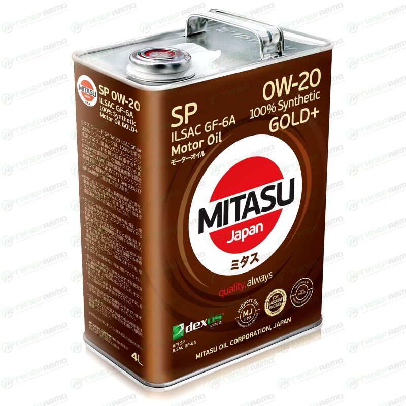 MITASU GOLD Plus SP 0W-20 ILSAC GF-6A 100% Synthetic — современное полностью синтетическое низковязкое ресурсосберегающее моторное масло. Состав продукта обновлен с учетом возросших требований, предъявляемых бензиновыми двигателями последнего поколения, и отвечает категории SP Американского Института Нефти (API) и стандарту качества GF-6A, устанавливаемого Международным комитетом по стандартизации смазочных материалов (ILSAC). Превосходит требования стандарта General Motors dexos1 Gen 2.