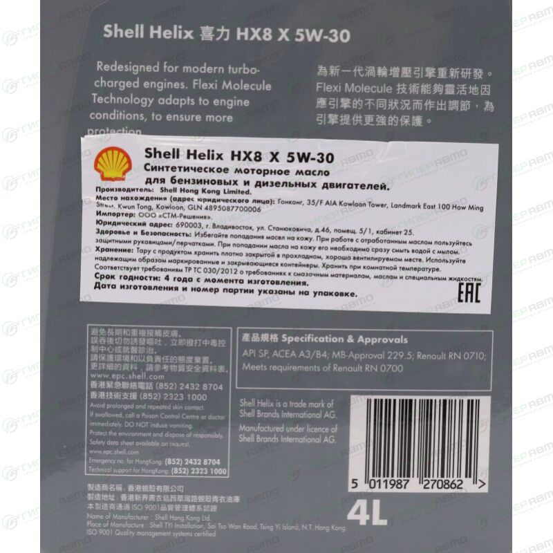 Вы можете купить масло моторное shell helix hx8 x 5w30, синтетическое, api sp, acea a3/b4, универсальное, 4л, арт. 550050811 в интернет-магазине моторных масел Гиперавто. Цена на SHELL 550050811, описание, характеристики и фотографии.