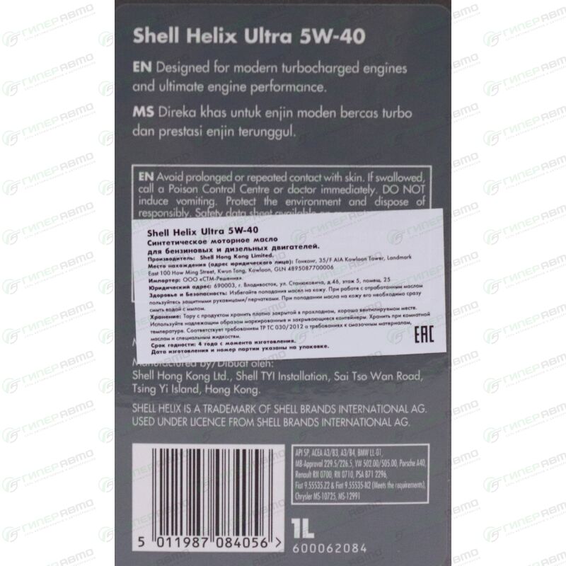 Отзывы на Масло моторное Shell Helix Ultra 5w40, синтетическое, API SP, ACEA A3/B3/B4, универсальное, 1л, арт. 550055904