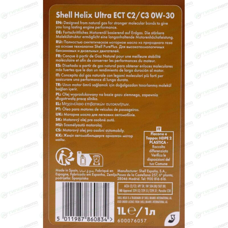Моторное масло Shell Helix Ultra ECT C2/C3 0W-30 создано на основе современных технологий для совместимости с системами снижения токсичности выхлопных газов, которые позволяют сохранять чистоту сажевых фильтров для поддержания высоких эксплуатационных характеристик двигателя. Также данное масло уменьшает трение между деталями двигателя для обеспечения повышенной экономии топлива.