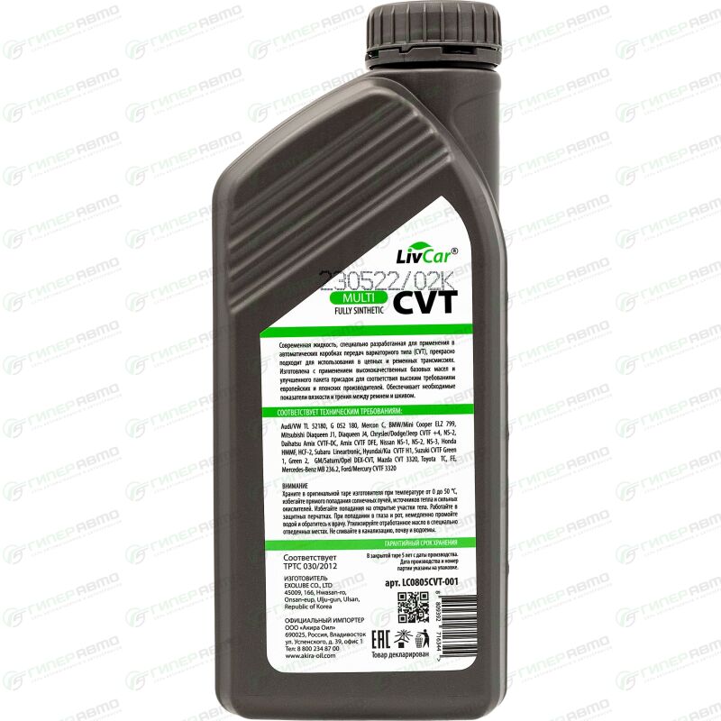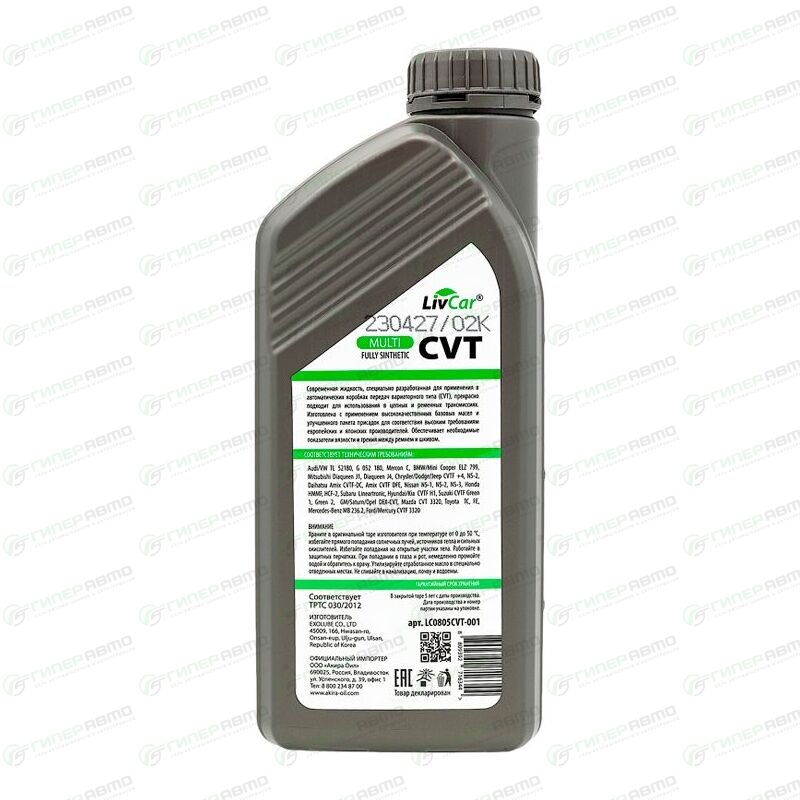 LIVCAR CVT MULTI рекомендуется для применения в цепных или ременных производителей: FORD, MERCURY, GM, CHRYSLER, DODGE, JEEP, AUDI, VW, BMW, MERCEDES BENZ, MITSUBISHI, DAIHATSU, HONDA, SUBARU, HYUNDAI, KIA, SUZUKI, TOYOTA, MAZDA, NISSAN, HONDA и тд. Перед использованием ознакомьтесь с руководством по эксплуатации автомобиля.