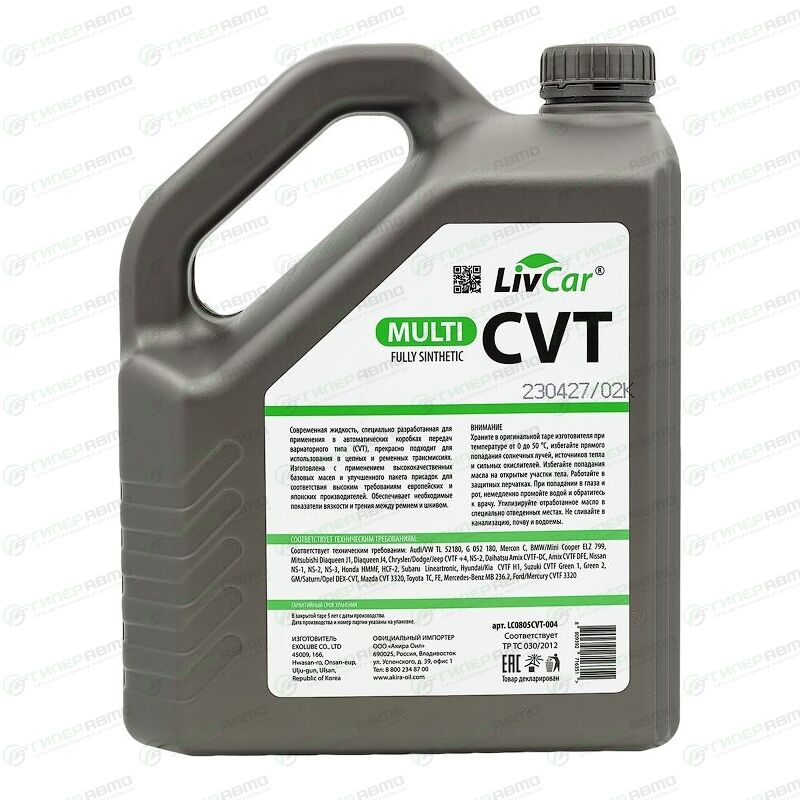 LIVCAR CVT MULTI рекомендуется для применения в цепных или ременных производителей: FORD, MERCURY, GM, CHRYSLER, DODGE, JEEP, AUDI, VW, BMW, MERCEDES BENZ, MITSUBISHI, DAIHATSU, HONDA, SUBARU, HYUNDAI, KIA, SUZUKI, TOYOTA, MAZDA, NISSAN, HONDA и тд. Перед использованием ознакомьтесь с руководством по эксплуатации автомобиля.