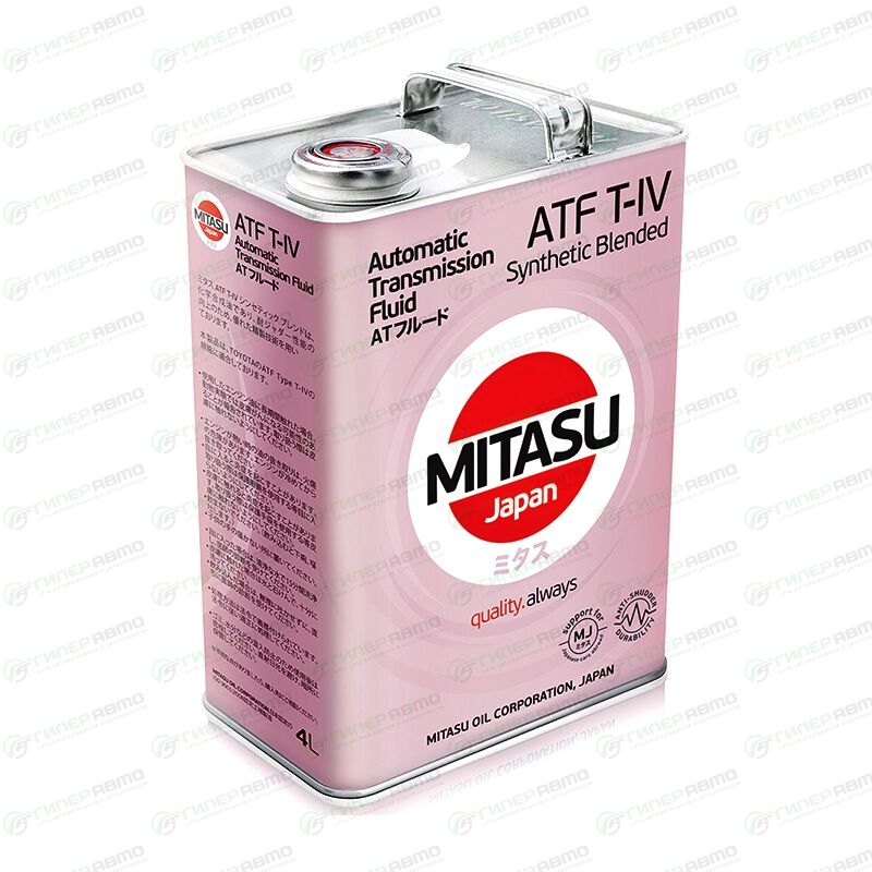 MITASU ATF T-IV Synthetic Blended — полусинтетическая жидкость для автоматических трансмиссий, для которых рекомендованы жидкости TYPE T-IV. Обладает прекрасными противовибрационными свойствами, отвечает международным стандартам и значительно превосходит требования TOYOTA для автоматических трансмиссионных жидкостей TYPE T-IV. Цвет жидкости красный.