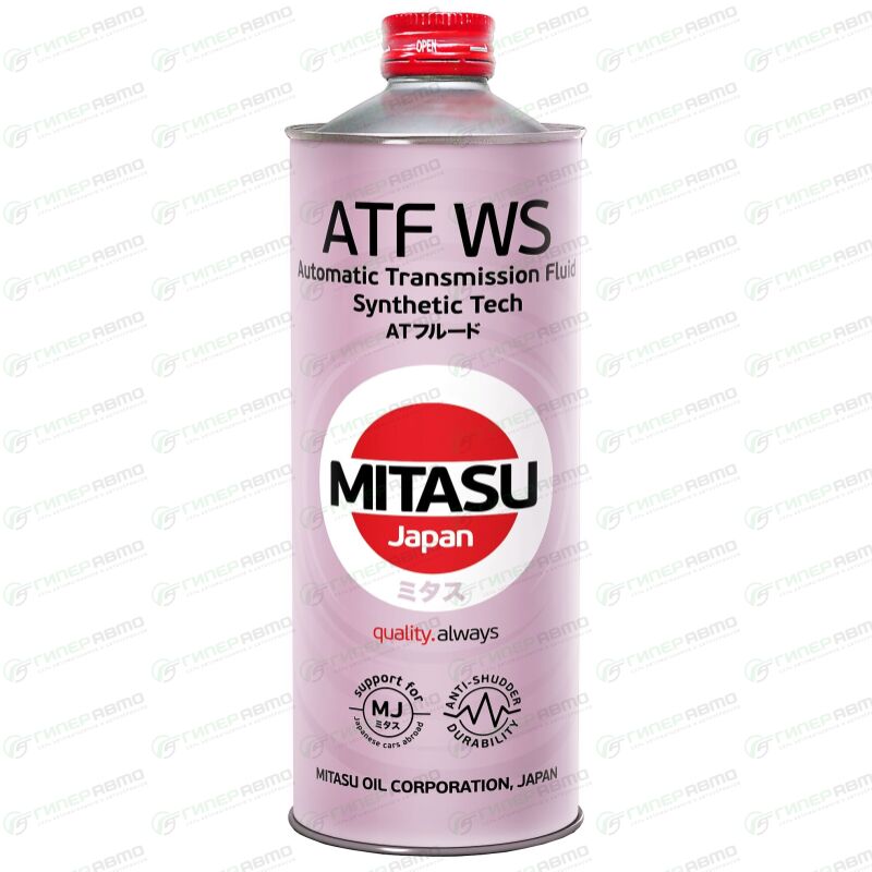 MITASU ATF WS Synthetic Tech — низковязкая жидкость для современных автоматических трансмиссий, изготовленная по синтетической технологии. Обладает прекрасными противовибрационными свойствами, отвечает международным стандартам и требованиям TOYOTA, AISIN WARNER и GM для автоматических трансмиссионных жидкостей типа ATF WS. Цвет жидкости красный.
