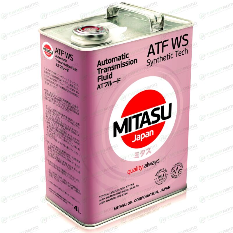 MITASU ATF WS Synthetic Tech — низковязкая жидкость для современных автоматических трансмиссий, изготовленная по синтетической технологии. Обладает прекрасными противовибрационными свойствами, отвечает международным стандартам и требованиям TOYOTA, AISIN WARNER и GM для автоматических трансмиссионных жидкостей типа ATF WS. Цвет жидкости красный.