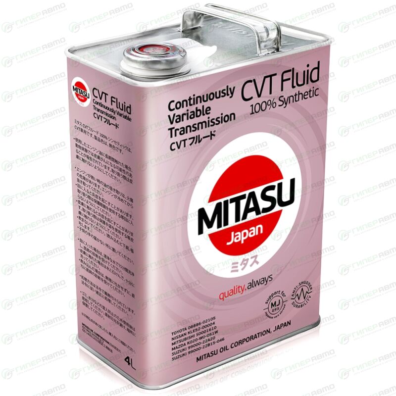 MITASU CVT FLUID 100% Synthetic используется в различных автомобилях с трансмиссией вариаторного типа. Подходит для некоторых гидравлических трансмиссий, механизмов с сервоуправлением и гидравлических систем.