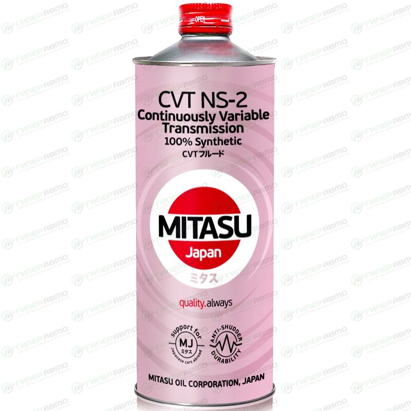 MITASU CVT NS-2 FLUID 100% Synthetic — полностью синтетическая универсальная трансмиссионная жидкость для автомобилей с бесступенчатой коробкой передачи (вариатор), для которых рекомендована жидкость типа NS-2. Полностью подходит для автомобилей NISSAN, а также других японских, корейских автомобилей и автомобилей других стран. Обладает отличными противовибрационными свойствами. Цвет жидкости зеленый.