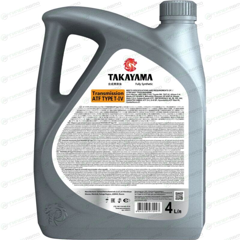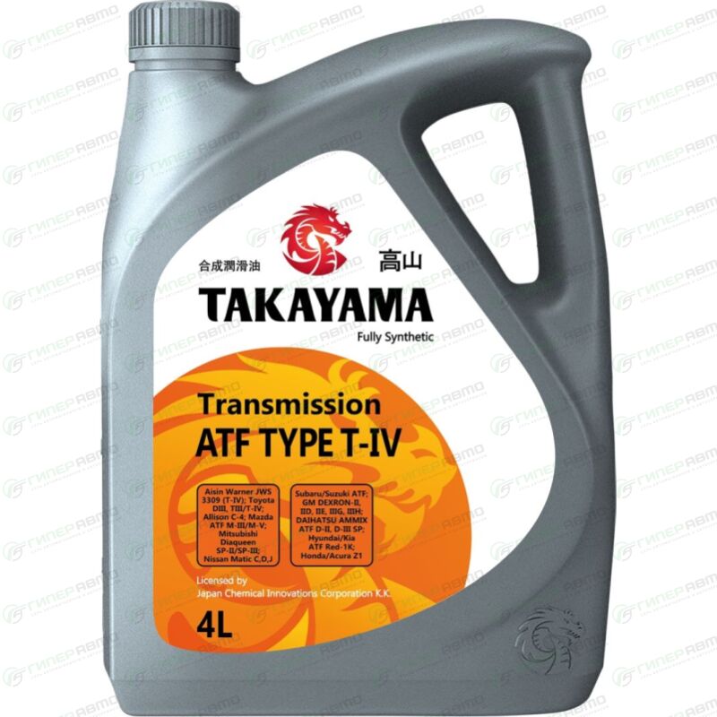 Жидкость для автоматических трансмиссий TAKAYAMA ATF Type T-IV — высококачественная синтетическая трансмиссионная рабочая жидкость, разработанная специально для применения в автоматических коробках передач легковых, внедорожных и коммерческих автомобилей Toyota и Lexus, в том числе трансмиссии AISIN.
