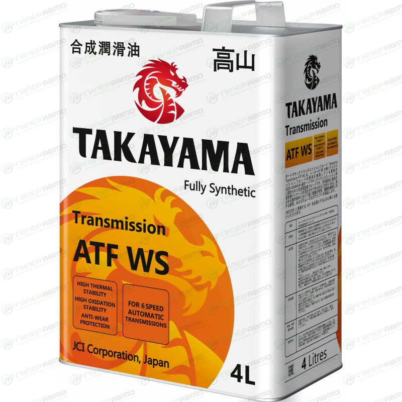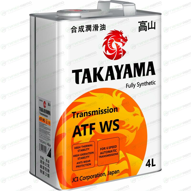 Жидкость для автоматических трансмиссий Takayama Transmission ATF WS — синтетическая маловязкая жидкость предназначена для современных 6-ступенчатых автоматических трансмиссий AISIN-WARNER, где производитель рекомендует использовать трансмиссионные жидкости спецификации WS. Жидкость изготавливается из смеси синтетических базовых масел и оригинального пакета присадок, что гарантирует высокие термоокислительные свойства, обеспечивает стойкость к механическому износу и плавное переключение передач в любых режимах эксплуатации.