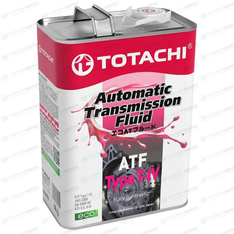 TOTACHI ATF TYPE T-IV — полностью синтетическая жидкость для автоматических трансмиссий, специально разработанная для превышения требований к сервисной заливке автомобилей TOYOTA и LEXUS с трансмиссиями AISIN WARNER, которым рекомендуется жидкость типа ATF T-IV. Продукт с высокими рабочими свойствами для использования в определенных трансмиссиях с блокировкой скольжения. Отличные характеристики способствуют тихому и плавному переключению передач и эффективной работе системы при жестких условиях эксплуатации.