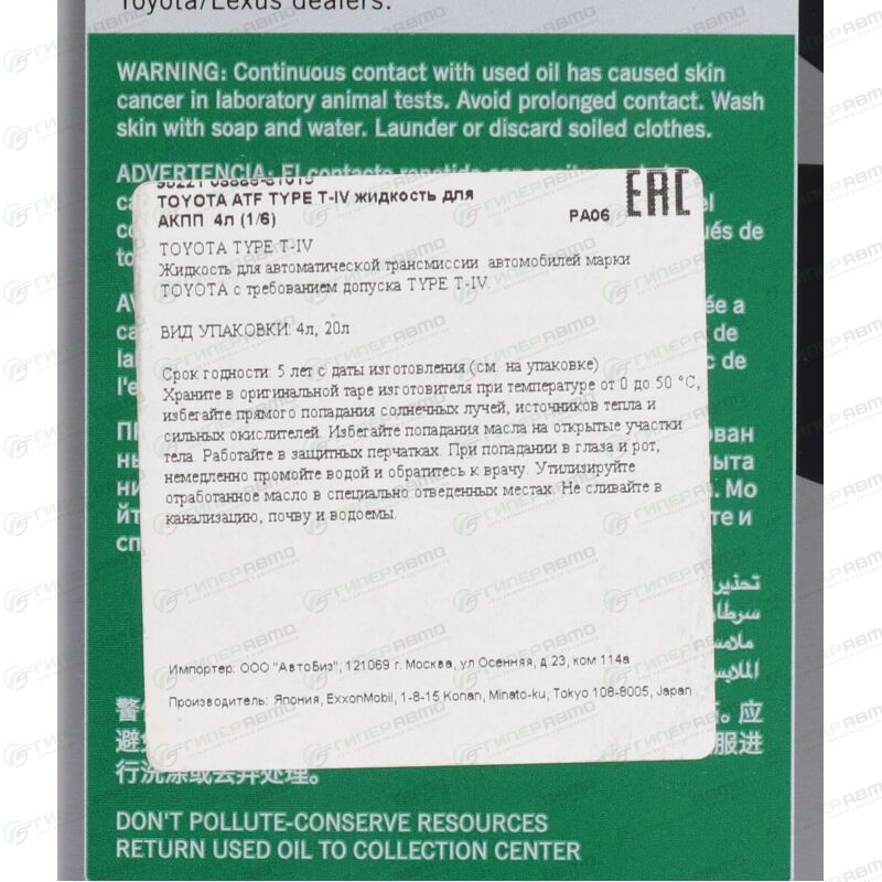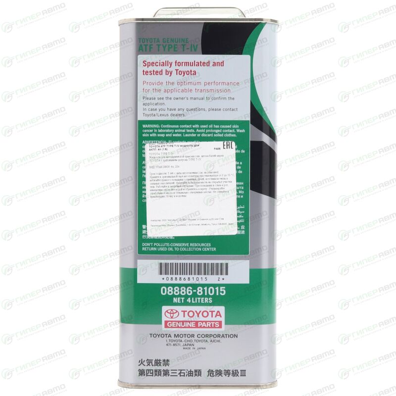 TOYOTA ATF Type IV трансмиссионное масло рекомендуется для автоматических трансмиссий и коробок передач с ручным переключением, когда предписано применение жидкостей для автоматических трансмиссий, а также рекомендуется для трансмиссий автомобилей прежних лет выпуска, сервомеханизмах, гидравлических системах и т.п. Создано с использованием базовых масел высокой степени очистки и тщательно сбалансированной комбинации фирменных присадок.