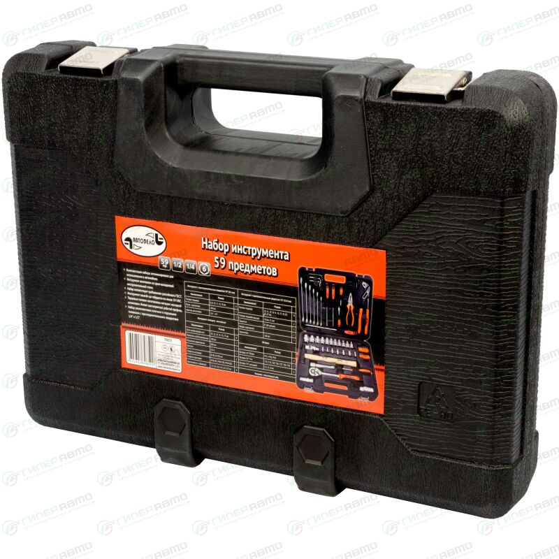 Комплектация набора оптимизирована для использования в автомобиле. Набор укомплектован торцевыми головками и ключами с присоединительными квадратами 1/4" и 1/2". Торцевые головки с шестигранным рабочим профилем. Изготовлены методом холодной штамповки. Инструмент закален до твердости не менее 39 HRC. Применено хромовое защитно-дtкоративное покрытие с эффектом матовой поверхности. Набор упакован в пластиковый чемодан.
