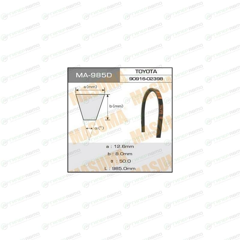Вы можете купить ремень клиновый masuma oem_90916-02398 в интернет-магазине приводных ремней Гиперавто. Цена на MASUMA MA-985, описание, характеристики и фотографии.