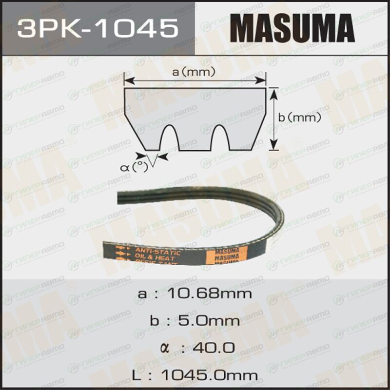 Вы можете купить ремень ручейковый "masuma" 3pk-1045 в интернет-магазине приводных ремней Гиперавто. Цена на MASUMA 3PK-1045, описание, характеристики и фотографии.