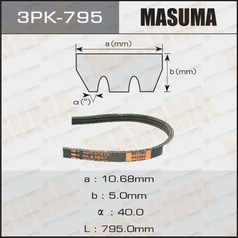Вы можете купить ремень ручейковый masuma 3pk- 795 в интернет-магазине приводных ремней Гиперавто. Цена на MASUMA 3PK-795, описание, характеристики и фотографии.