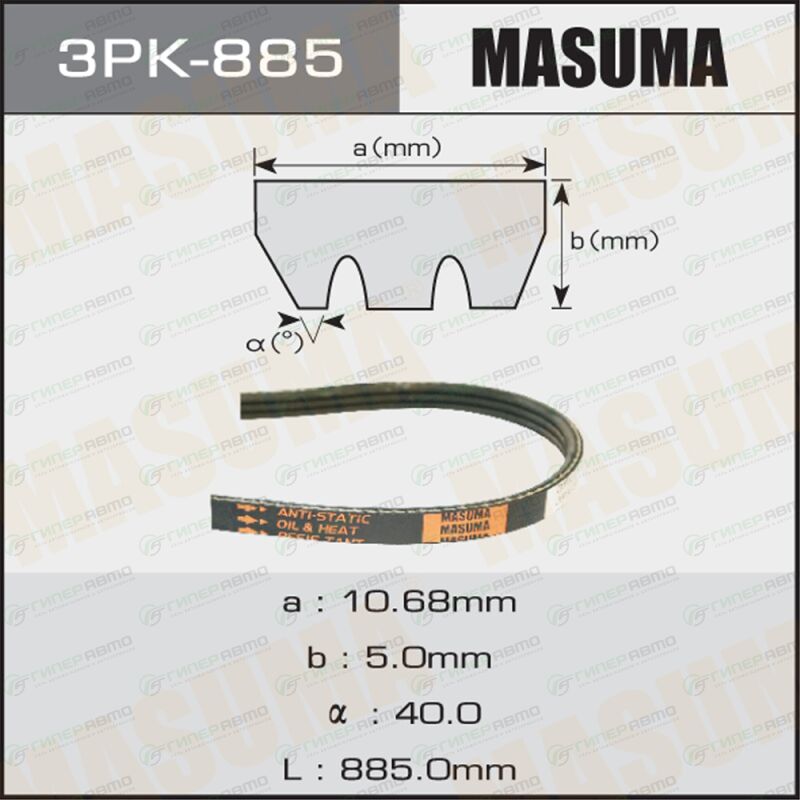 Вы можете купить ремень ручейковый masuma 3pk- 885 в интернет-магазине приводных ремней Гиперавто. Цена на MASUMA 3PK-885, описание, характеристики и фотографии.
