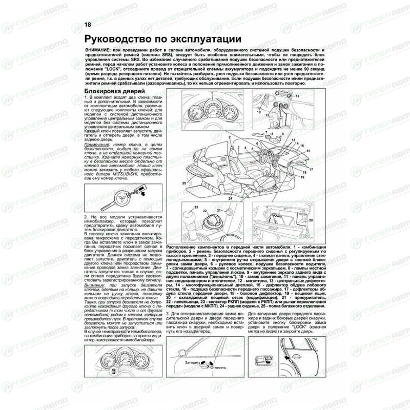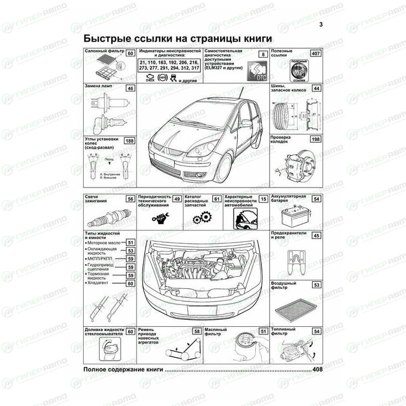 Издание содержит руководство по эксплуатации, подробные сведения по техническому обслуживанию автомобилей, диагностике, ремонту и регулировке элементов систем двигателя (в т.ч. впрыска топлива (MPI), изменения фаз газораспределения (MIVEC), зажигания, запуска и зарядки), механической и роботизированной коробок переключения передач (МКПП и РКПП), тормозной системы (включая антиблокировочную систему тормозов (ABS), электронную систему распределения тормозных усилий (EBD), противобуксовочную систему (TLC), систему курсовой устойчивости (ASC)), рулевого управления (в т.ч. электроусилителя рулевого управления (EPS)) и под-вески, кузовных элементов, систем кондиционирования (АС), отопления и вентиляции, а также системы пассивной безопасности (SRS).