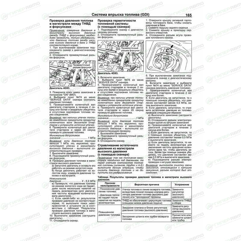 - Приведены инструкции по использованию самодиагностики системы управления двигателем, автоматической коробки передач (АКПП), вариатором (CVT), ABS (антиблокировочной системы тормозов), EBD (электронной системы распределения тормозных усилий), SRS (системы пассивной безопасности), системы поддержания скорости, MMCS (мультикоммуникационная система Mitsubishi), SWS (системы мультиплексной связи), системы кондиционирования, процедуры проверки параметров в разъемах электронных блоков управления различными системами.