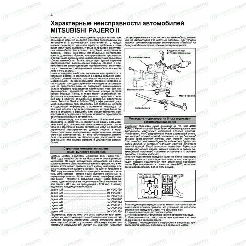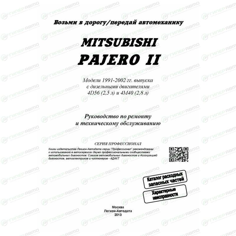 В руководстве дается пошаговое описание процедур по эксплуатации, ремонту и техническому обслуживанию автомобилей Mitsubishi Pajero 1991-2002 гг. выпуска с левосторонним и правосторонним рулевым управлением, оборудованных дизельными двигателями 4D56 (2,5 л) и 4M40 (2,8 л).