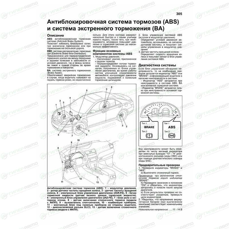 Издание содержит руководство по эксплуатации, подробные сведения по техническому обслуживанию, диагностике, ремонту и регулировке элементов систем двигателя (в т.ч. впрыска топлива, изменения фаз газораспределения (VVT), зажигания, запуска и зарядки), элементов сцепления, механических и автоматических коробок передач (МКПП и АКПП), тормозной системы (включая антиблокировочную систему тормозов (ABS), систему экстренного торможения (ВА), противобуксовочную систему (TRC) и систему курсовой устойчивости (VSC)), рулевого управления, подвески (в т.ч. системы контроля давления в шинах), кузовных элементов, систем кондиционирования (АС) и вентиляции, системы пассивной безопасности (SRS).
